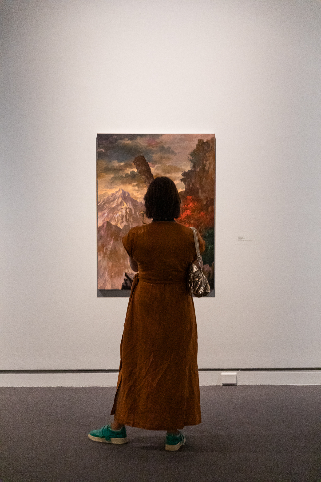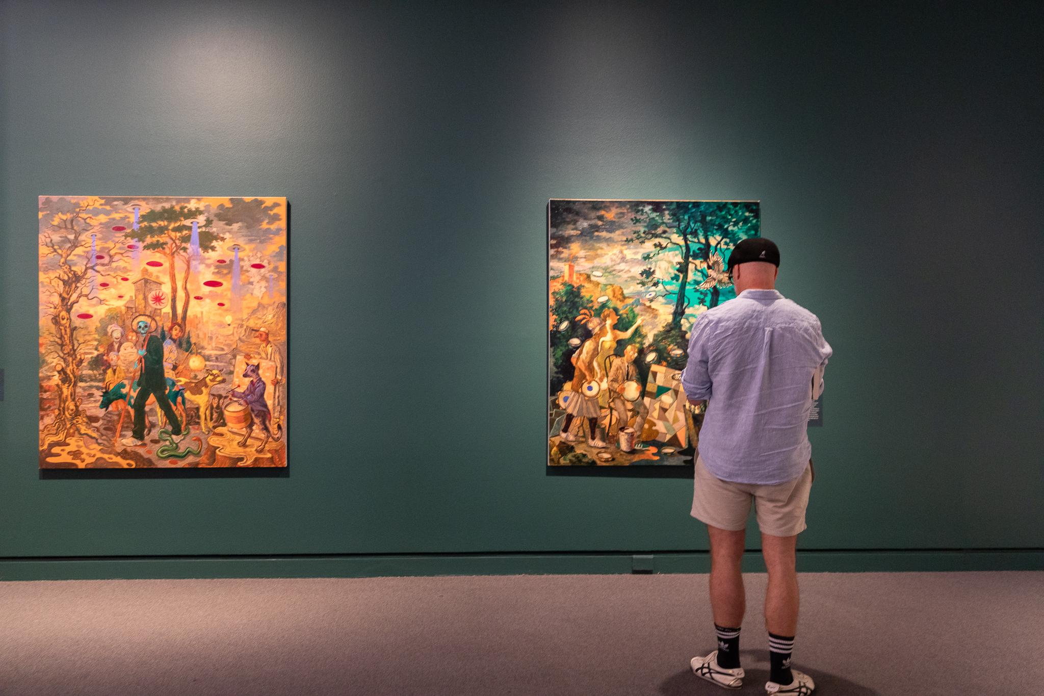 Michael Vale is a Melbourne-based artist whose practice brings together Romantic traditions, absurdist theatre, dark fiction and a mischievous sense of humour. Over several decades, he has developed a distinctive visual language that fuses the grandeur of dramatic landscapes with the unexpected presence of surreal and often comical figures. His paintings and installations are populated with spectral characters, cartoonish costumes, and shadowy, theatrical backdrops that unsettle as much as they amuse. By deliberately disrupting clear narrative readings, Vale creates scenes that hover between the familiar and the uncanny, inviting viewers into a world where meaning is unstable and tone constantly shifts.